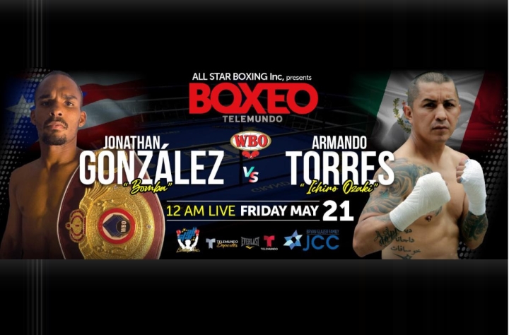 All Star Boxing has announced the main event of their May 21st show, which will air live with an audience from the Bryan Glazer JCC Center in Tampa, Florida. World ranked WBO/NABO light flyweight champion Jonathan “Bomba” Gonzalez (23-3-1 13 KO’s) of Caugas, Puerto Rico defends his title against Armando “Ichiro Ozeki” Torres (26-18 19 KO’s) of Mexico City, Mexico in a 10 round bout.