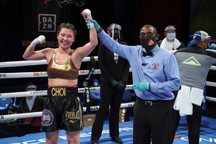 Choi applied steady pressure, successful in cutting off the ring. The unbeaten champ was on point with her jab throughout round six, following up with a left hook and later with a right hand straight down the middle.